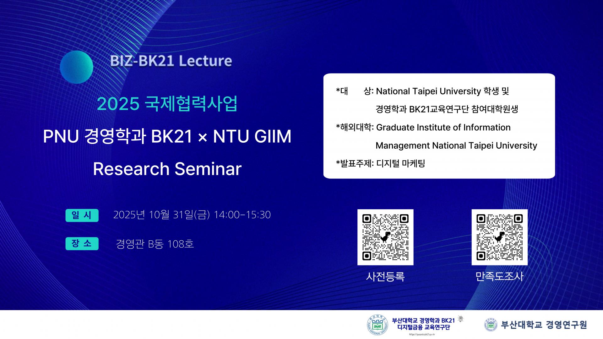 2025 국제협력사업 일환의 PNU 경영학과 BK21 × NTU GIIM Research Seminar 개최 안내